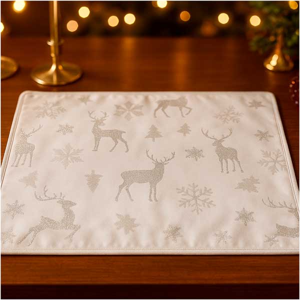 Color: Tela Blanca con bordado plateado “Renos y copos en patron”